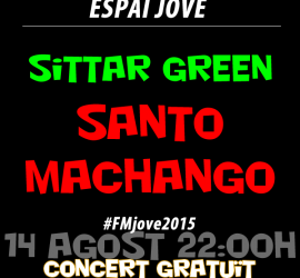14/08/2015 @ 22:00 – 23:55 – Sittar Green a la festa major de Castelldefels 2015 El pròxim divendres dia 14 a les 22:00h , estarem al 1er ESPAI JOVE a la festa major de Castelldefels, segons la predicció meteorològica no s’acosten pluges … tot i així , li posarem unes espelmes al Santo Machango perquè ens protegeixi. Veniu veniu!